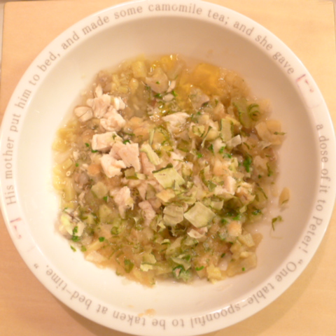 ささみ6.5g 納豆3g さつま芋15g ブルーベリー6g りんご20g きゃべつ6g ブロッコリ芽6g もやし5g マッシュ茸7g 昆布0.05g 亜麻仁油1g 小岩井10g 湯80cc ebi1T bio2/3g Ca0.2g
