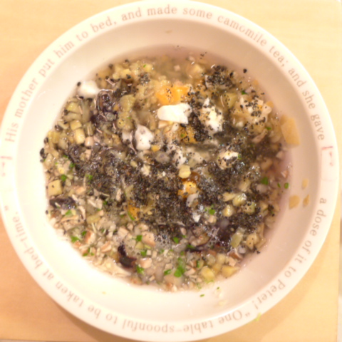 卵12g(卵白8g 卵黄4g)納豆2.1g 豆腐6g ブルーベリー6g りんご20g きゃべつ6g ブロッコリ芽5g もやし6g マッシュルーム8g 黒ごま2g 小岩井10g 湯80cc ebi1T bio2/3g のこぎりやし1cap