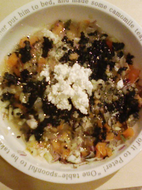 すずき10g 納豆5.5g りんご20g紫キャベツ6g さつまいも10g 人参12g 舞茸10g プチトマト15g 胡瓜8g 海苔0.6g カテージ3g 黒ごま3g 小岩井20g 湯 ebios1 bio2g Zn1/10 Ca0.2
