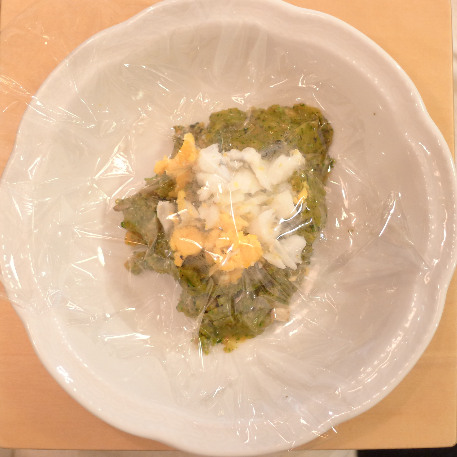 【夕ご飯】卵(白身5g 黄身3g)8g 芋12g 納豆3g きゃべつ5g ブロッコリ5g 小松菜5g 舞茸5g 南瓜12g トマト(かずさんち)19g ブルーベリー5.5g 黒ごま2.5g ebi1T bio1g EsC0.3g cilantro1cc Zn1/8T湯90cc