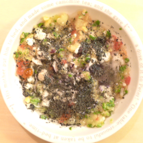 ささみ5g 豆腐10g さつま芋17g ブルーベリー6g きゃべつ5g アスパラガス5g おくら5g 18g りんご20g 黒ごま2g 小岩井10g 湯100cc ebi1T bio2/3g VC0.1g Ca0.2g のこぎりやし1cap