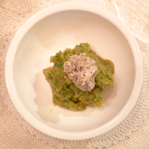 時鮭8g 黒豆納豆2.5g 芋15g 南瓜12g トマト30g きゃべつ5g ブロッコリ芽3g 小松菜5g 青アスパラ10g 白アスパラ5g ebi2T bio1.5g Cilantro1g 黒ごま1g 小岩井3g 俊粉1g 湯80g
