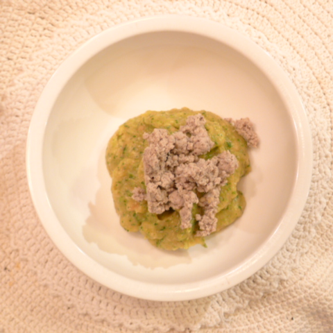 ささみ若鶏8g 黒豆納豆2.3g 芋15g 南瓜12g トマト30g きゃべつ5g ブロッコリ5g 小松菜2.5g おくら5g ebi2T bio1.5g EsterC0.2g 黒ごま2g 俊粉1g 湯100g