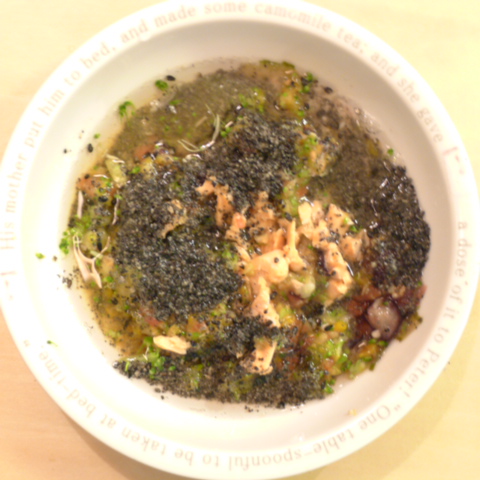 鮭7.5g さつま芋15g 南瓜5g ブルーベリー6g きゃべつ6g ブロッコリ5g おくら5g トマト20g 舞茸出汁5g 昆布0.3g 黒ごま2.5g 小岩井5g 湯100cc ebi1T bio2/3g VC0.1mg Ca0.2g zn1/8T