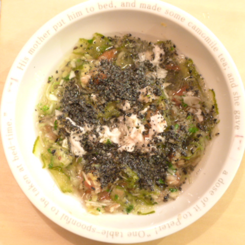 ぶり(熊本養殖)7.5g 納豆2.1g さつま芋15g ブルーベリー6g きゃべつ5g ブロッコリ芽5g おくら芽5g トマト18g 舞茸5g 昆布0.5g 黒ごま2.5g 湯60cc bio2/3g VC0.2g