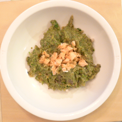 【朝ごはん】鮭7g 雪誉納豆3 芋12g きゃべつ5g ブロッコリ5g 小松菜5g 南瓜12g トマト(北海道)31g 舞茸5g 黒ごま2.5g ブルーベリー6g 湯80cc bi1T bio1g EsC0.3g Cilantro1cc
