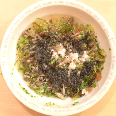 ぶり(高知養殖)7g 納豆2.1g さつま芋15g ブルーベリー6g きゃべつ5g ブロッコリ7g もやし5g おくら5g トマト14g 舞茸7g 黒ごま2.5g 昆布0.3g 小岩井10g 湯110cc ebi1T bio2/3g VC0.1g