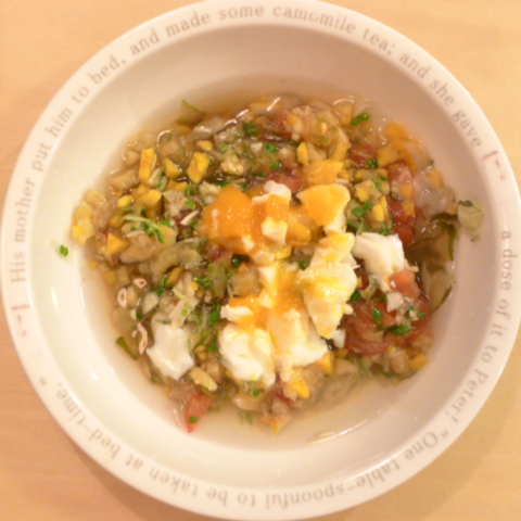 半熟卵11g(卵白6g 卵黄5g) 納豆2.2g 芋(坂出金時)15g 南瓜(北海道)5g 南瓜8g ブルーベリー6g きゃべつ6g ブロッコリ芽6g トマト30g 舞茸出汁5g 昆布0.5g 黒ごま2g 小岩井10g 湯70cc bio2/3g VC0.2g