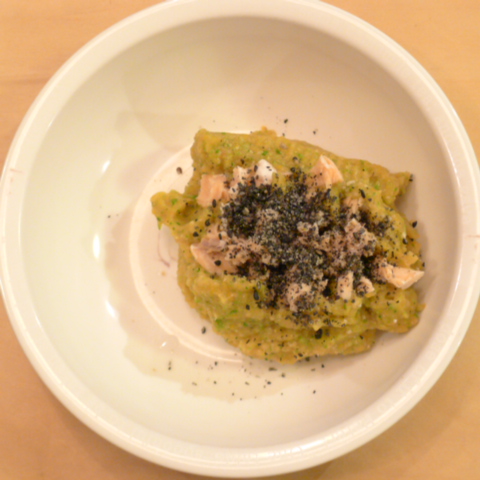 【朝ご飯】白鮭(北海道)8g 黒豆納豆3.3g 芋15g 南瓜12g トマト(秋田)35g きゃべつ7g ブロッコリ7g おくら5g 舞茸5g 亜麻仁油0.5g ブルーベリー7g bi1T bio1g plmC0.3g Ca0.2g Zn1/8T 六条麦茶70c