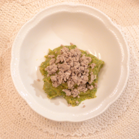 ささみ(四国)8.5g 黒豆納豆2.5g 坂出金時15g 南瓜12g トマト29g きゃべつ5g ブロッコリ5g 小松菜5g おくら5g ebi2T bio1.5g PalmC0.2g Cil0.7g 俊粉1g 湯90g ささみ煮汁