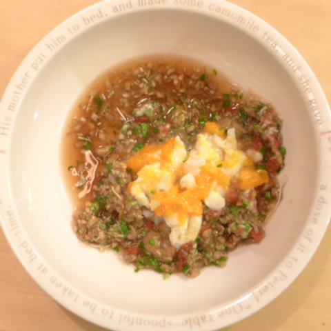 ②半熟卵11g(卵白7g 卵黄4g) 納豆2.1g きゃべつ5g ブロッコリ芽5g マッシュ茸10g+出汁10g トマト11g ebi1T bio2/3g Zn1/8T (→食べない)