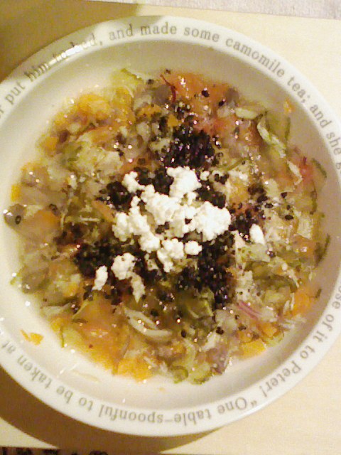 さんま9g 納豆3.5g キャベツ5g きゅうり7g なす8g 人参10g プチトマト18g 舞茸6g さつま芋7g 昆布0.3g 黒ごま3g 湯100cc カッテージ3g 小岩井20g ebi2錠 bio2g Vc0.2g Ca0.2g Zn1/10 のこぎりやし ブルーベリー6g