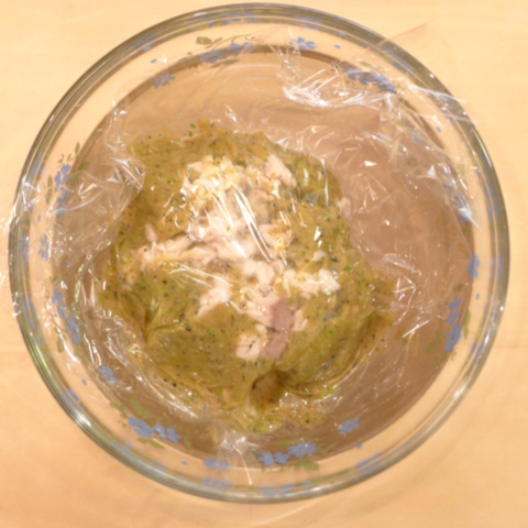 【おやつ】ブルーベリー8g 雪誉納豆3g 麩(半兵衛)0.5g 六条麦茶 芋10g きゃべつ5g