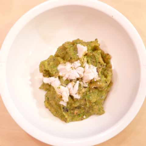 【夕ごはん】ぶり(北海道)7g 芋12g オクラ(なな産)5g きゃべつ6g ブロッコリ5g 小松菜5g トマト(北海道)30g 黒ごま2g ebi1T bio1g EsC0.3g Cilantro1cc Zn1/8T 湯
