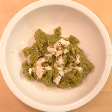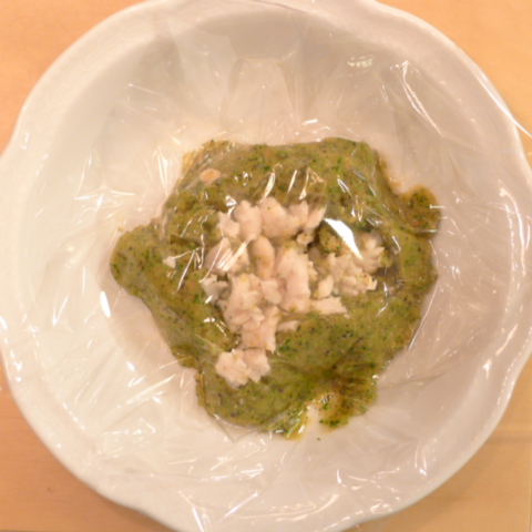ささみ7g 納豆3.4g 芋12g 南瓜12g きゃべつ6g ブロッコリ6g 小松菜5g トマト(北海道)31g ebi1T bio1g EsC0.3g Zn1/8Tブルーベリー6.8g 湯80cc