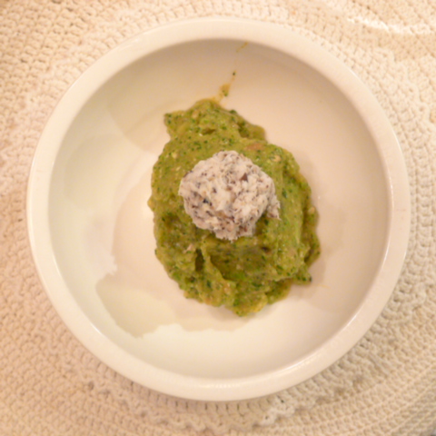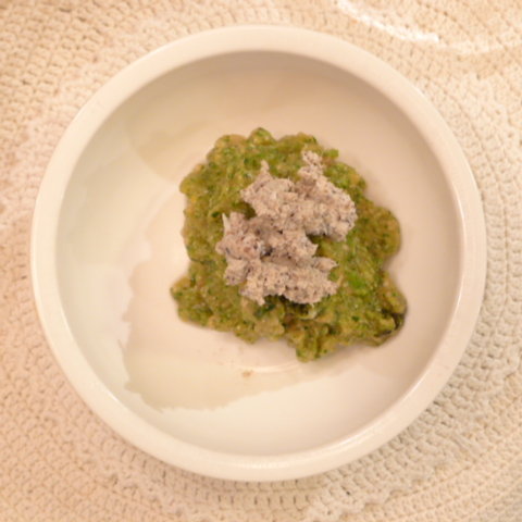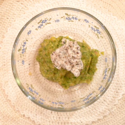 鯛(愛媛養殖)8.5g 黒豆納豆2.1g 芋16g 南瓜12g トマト29g きゃべつ5g ブロッコリ5g 小松菜5g おくら5g ebi2T bio1.5g EsterC0.25g Cilantro1g 俊粉1g 黒ごま1.5g 湯60g