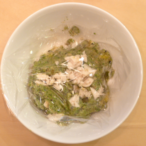 鱈(北海道)7g 雪誉納豆2.3g 鳴門金時12g きゃべつ6g ブロッコリ5g 小松菜5g 舞茸5g 南瓜10gトマト30g 黒ごま1.5g ブルーベリー6g ebi1T bio1g EsC0.3g cilantro1cc Zn1/8T 湯80cc