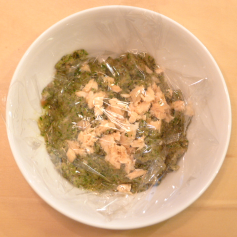 時鮭(北海道)7g 雪誉納豆3g 鳴門金時11g きゃべつ5g ブロッコリ5g 小松菜5g 南瓜11gトマト22g 黒ごま2.5g ブルーベリー5g ebi1T bio1g EsC0.3g cilantro1cc Zn1/8T 湯80cc