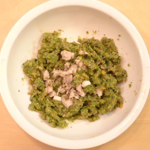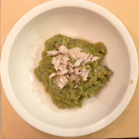 ぶり(鳥取天然)7g 黒豆納豆3.2g 安納芋12g 香菜1.5g 春きゃべつ5g ブロッコリ8g 小松菜5g 舞茸5g 南瓜11gトマト30g 黒ごま2g ブルーベリー5g ebi1T bio1g EsC0.3g Zn1/8T 湯80cc