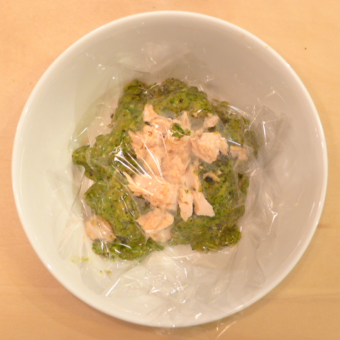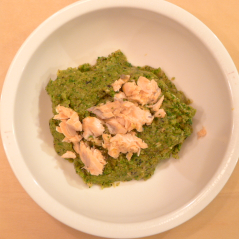 銀鮭(鳥取養殖)7g 安納芋10g 香菜1.5g 春きゃべつ5g ブロッコリ7g 小松菜5g 舞茸5g 南瓜11gトマト20g 黒ごま2g りんご25g ebi1T bio1g EsC0.3g Zn1/8T湯50cc