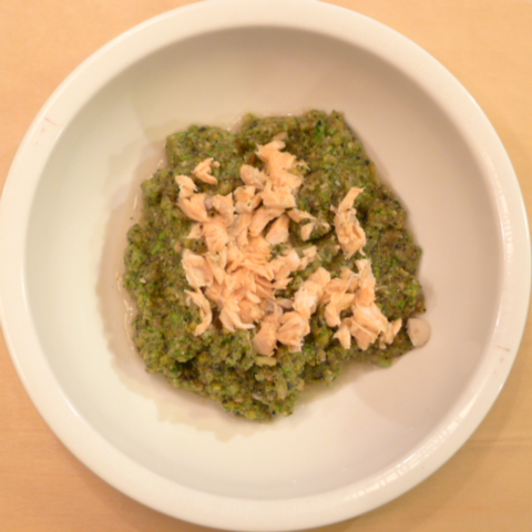 銀鮭(島根養殖)7g 黒豆納豆3g 芋12g 春きゃべつ6g ブロッコリ芽5g 舞茸5g 南瓜11gトマト26g 黒ごま2g ブルーベリー10g ebi1T bio1g EsC0.3g cilantro1cc Zn1/8T 湯90cc