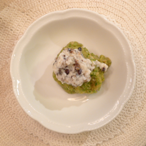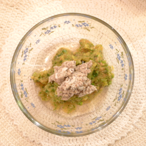 【夕ご飯】ささみ9.5g 黒豆納豆2.5g 芋16g 南瓜11g トマト30g きゃべつ5g ブロッコリ5g 小松菜5g 青アスパラ10g ebi2T Cilantro1g 俊粉1g 湯50g