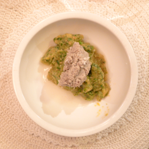 ぶり(山口天然)8.5g 黒豆納豆2.5g 芋15g 南瓜12g トマト30g きゃべつ5g ブロッコリ6g 小松菜5g 青アスパラ5g ebi2T bio2g Cilantro1g 俊粉1g 黒ごま1g 黒ごま1.5g 小岩井3g 湯100g