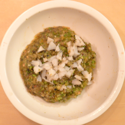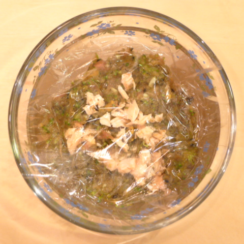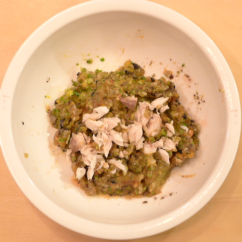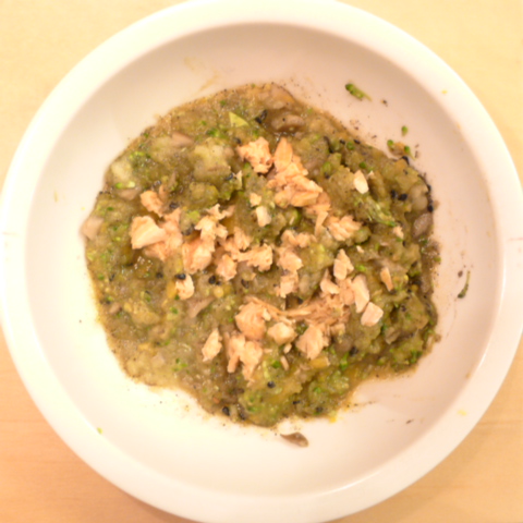【夕ご飯】鮭(アトランティック)7g 安納芋10g 春きゃべつ5g ブロッコリ5g 舞茸5g+出汁3g 南瓜(鹿児島)9g トマト20g ebi1T bio1g EsC0.3g cilantro1cc Zn1/8T 雪誉納豆2.1g 湯60cc
