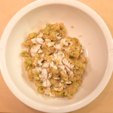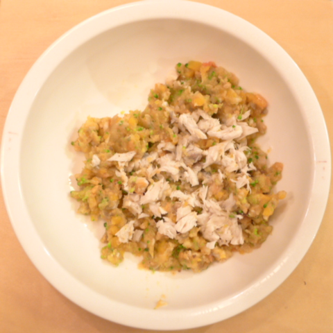 さわら(愛媛)7g 芋10g きゃべつ6g ブロッコリ6g 南瓜11g 舞茸5g トマト21g 白ごま1.5g ebi1T bio1g EsC0.3g Zn1/8T 納豆3g ブルーベリー5g 湯100cc