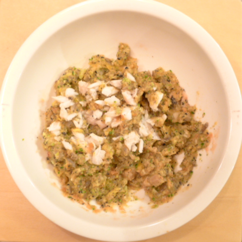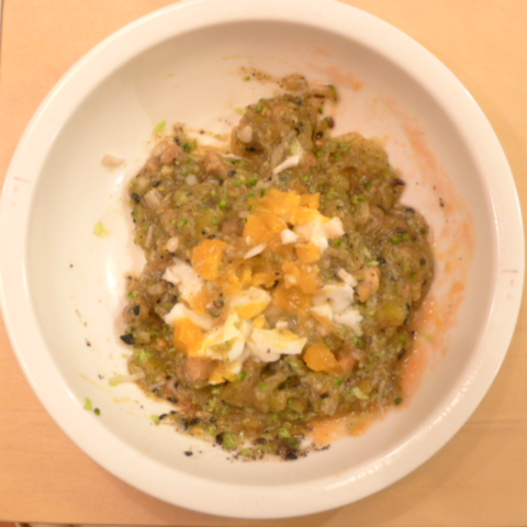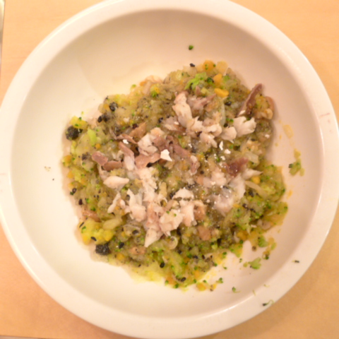 ぶり(長崎)7g 黒豆納豆2.8g 芋10g きゃべつ5g ブロッコリ5g 南瓜6g 舞茸5g トマト15g 黒ごま1.5g ebi1T bio2/3g EsC0.3g VC0.05g Zn1/8T 小岩井10g 湯50cc