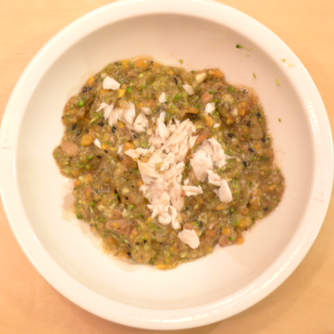 あじ(石川)7g 納豆3.8g 芋10g 春きゃべつ5g ブロッコリ5g 南瓜5g えのき5g りんご253g 黒ごま1.5g ebi1T bio2/3g EsC0.3g VC0.05g Zn1/8T 小岩井10g 湯100cc