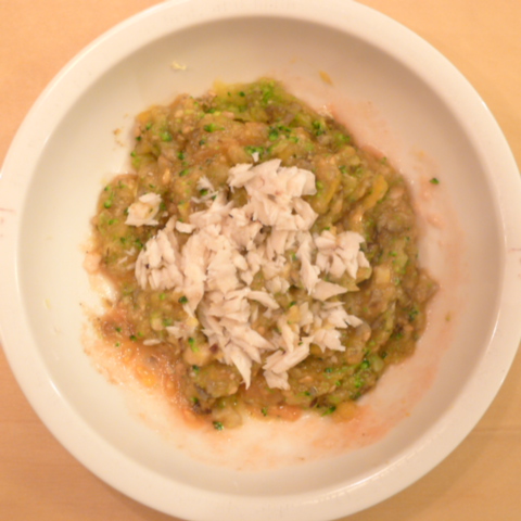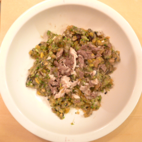 ぶり(長崎)7.5g 黒豆納豆2.5g 芋10g きゃべつ5g ブロッコリ5g 南瓜(沖縄)7g 舞茸出汁3.5g トマト20g ebi1T bio2/3g EsC0.3g Zn1/8T小岩井15g 湯80cc
