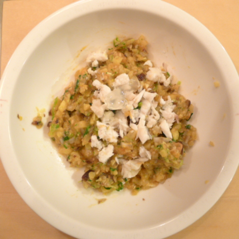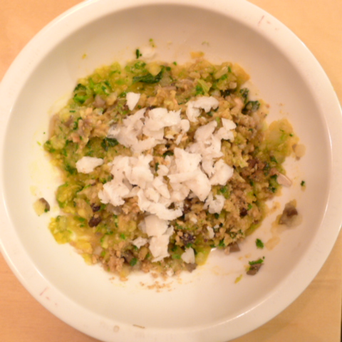 ぶり(長崎)7g 黒豆納豆2g 芋10g きゃべつ5g 菊菜(柳澤家産)3.5g 南瓜(沖縄)8g 舞茸出汁10g トマト25g ebi1T bio2/3g EsC0.3g Zn1/8T小岩井10g 湯80cc