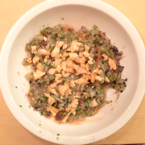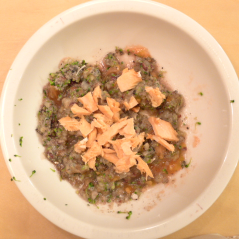【夕ご飯】鰆(長崎)7g 黒豆納豆3g 鳴門金時10g きゃべつ5g ブロッコリ5.5g りんご20g 黒ごま1.5g 昆布0.2g 石榴5g ebi1T bio2/3g EsC0.3g VC0.05g Zn1/8T小岩井10g 湯100cc