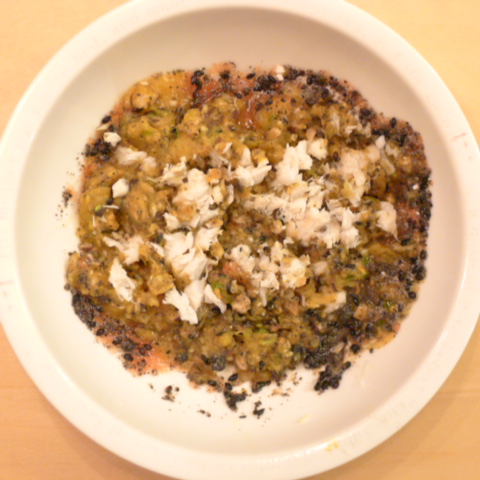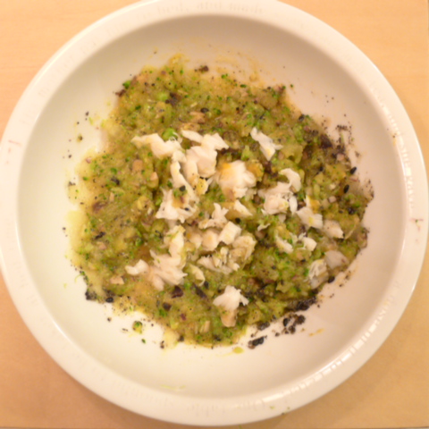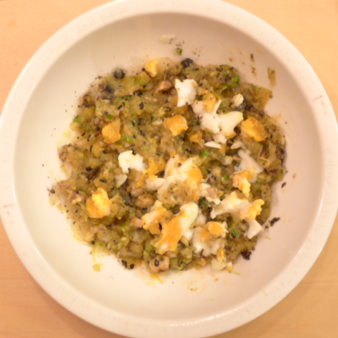 さわら(山口)7g 黒豆3g 安納芋10g きゃべつ5g ブロッコリ5.5g 南瓜(北海道)8g りんご25g 黒ごま1.5g ebi1T bio1g esterC0.3g Zn1/8T 小岩井10g 湯60cc