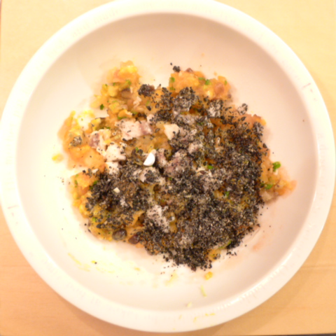 【お家に帰って続き】+りんご12g ぶり(長崎)3g 黒ごま0.5g 小岩井15g 湯100cc