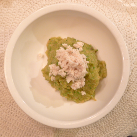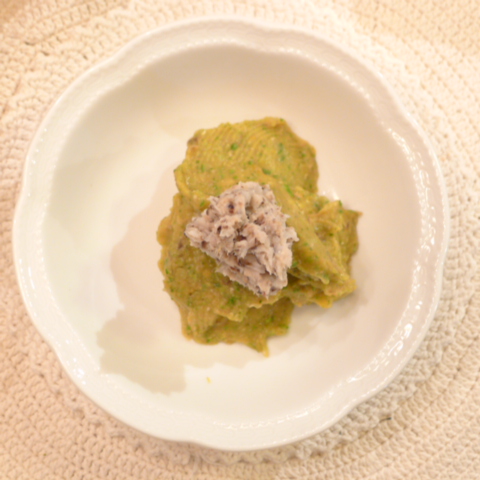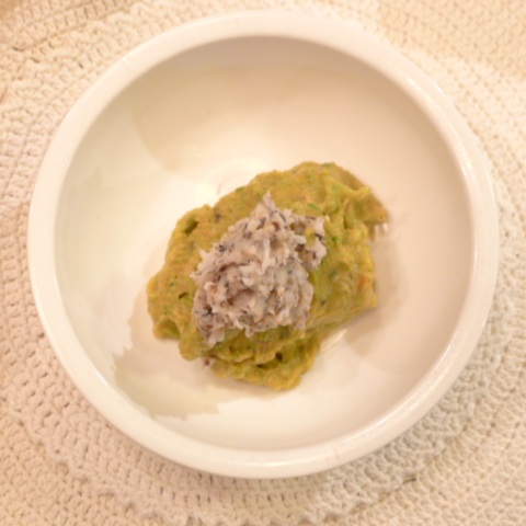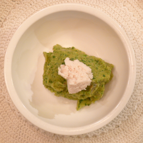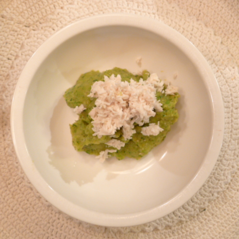 ささみ8.5g 芋16g 南瓜12g トマト27g きゃべつ5g ブロッコリ5g 小松菜5g おくら5g 青アスパラ10g 白アスパラ5g ebi2T bio1.5g Cilantro1g 小岩井3g 俊粉1g 黒ごま1g 湯90g