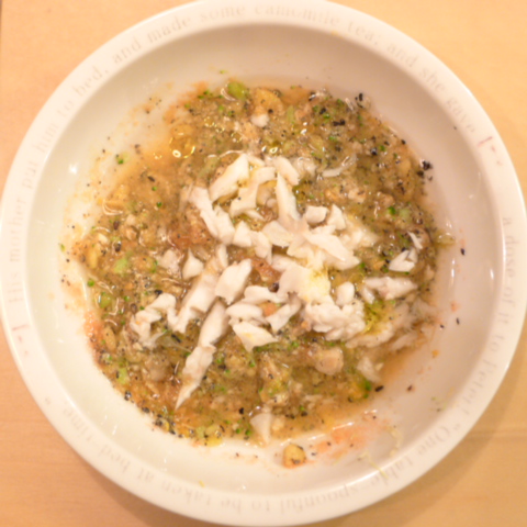 【夕ご飯】あじ7g 安納芋11g キャベツ5g ブロッコリー5g 南瓜5g 柿20g りんご20g 亜麻仁油1g 黒ごま1.5g ブルーベリー1g 小岩井10g 湯100cc ebi1T bio2/3g VC0.05g Ca0.2g Zn1/8T