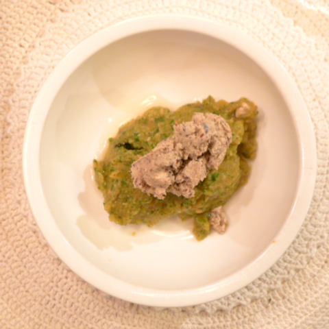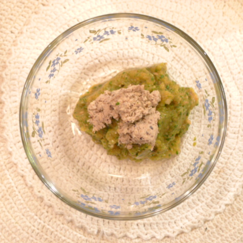 本ます(北海道)8g 黒豆納豆2.5g 芋15g 南瓜13g トマト27g きゃべつ5g ブロッコリ5g 小松菜5g 青アスパラ5g 紫アスパラ5g 白アスパラ5g 黒ごま1.5g ebi2T bio1.5g Cilantro1g 黒ごま1g 小岩井3g 俊粉0.5g 湯100g