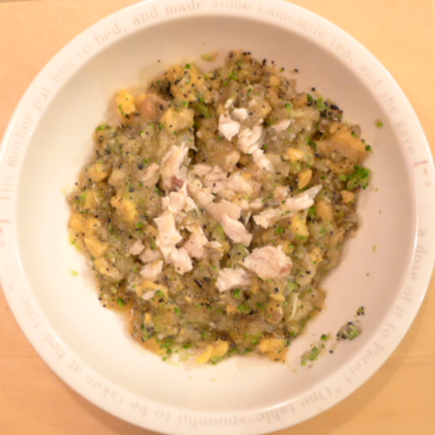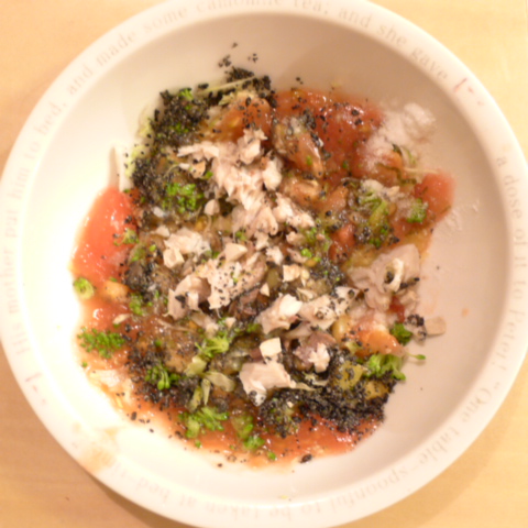 【夕ご飯】黒かれい7g 豆腐8.5g 安納芋10g キャベツ3.5g ブロッコリ3.5g トマト25g 舞茸3.5g 黒ごま2g 昆布0.2g ブルーベリー1g 小岩井10g ebi1T bio2/3g Ca0.2g Zn1/8T 湯60cc