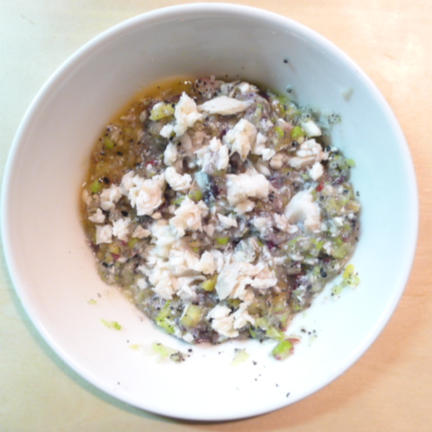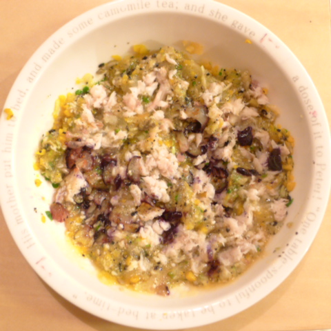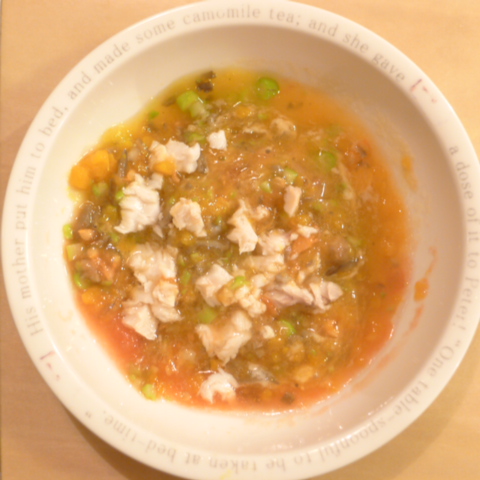 ぶり(熊本養殖)10g 豆腐15g 安納芋10g 黒ごま2g きゃべつ5g アスパラガス10g ブルーベリー10g りんご30g 柿15g 湯30cc