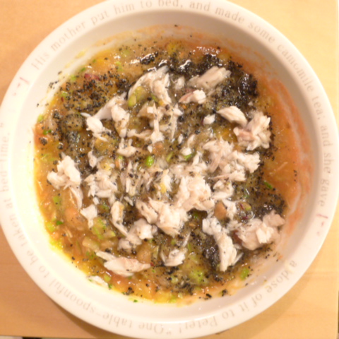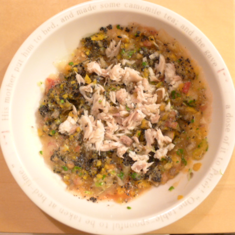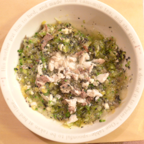 あじ10g 納豆2.8g 安納芋9g 南瓜8g きゃべつ5g ブロッコリ芽6g トマト20g りんご20g ブルーベリー6g 黒ごま3g 小岩井5g 湯50cc ebi1/2T bio0.8g Ca0.2g Zn1/10T