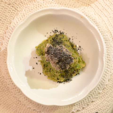 ぶり(鹿児島養殖)8.5g 黒豆納豆2.4g 芋16g 南瓜7.5g トマト32g きゃべつ5g ブロッコリ5g スナップえんどう5g おくら5g 青アスパラガス(美瑛)5g 白アスパラガス(美瑛)3g ebi2T bio1.5g Cilantro1g 俊粉0.5g 小岩井2g 湯40g