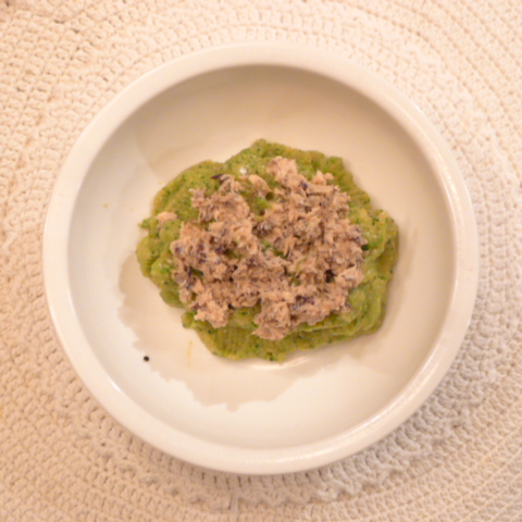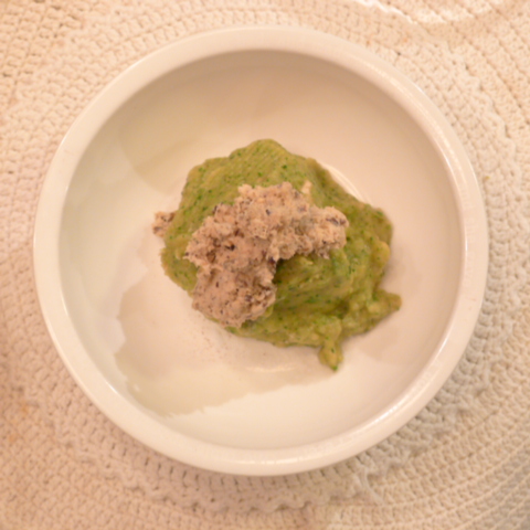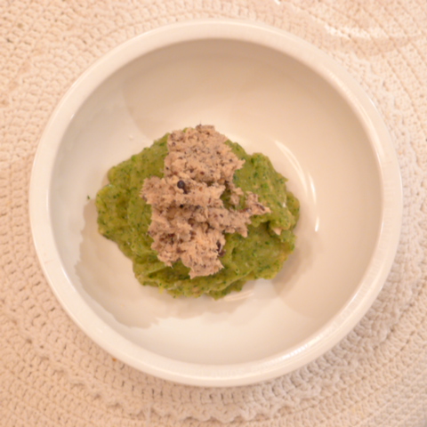 白鮭(北海道青森沖)8.5g 黒豆納豆3g 芋15g 南瓜12g トマト26g きゃべつ5g ブロッコリ5g 小松菜5g おくら5g ebi2T bio1.5g PalmC0.2g Cil1g 黒ごま2g 俊粉2g 湯90g 鮭の煮汁