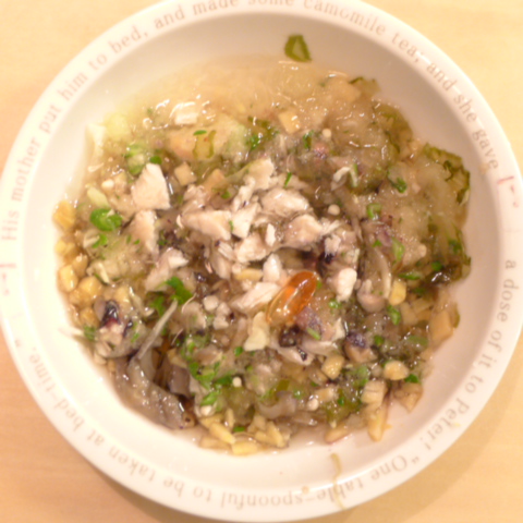 ささみ7g 納豆2.1g さつま芋10g ブルーベリー6g きゃべつ6g ブロッコリ芽6g りんご20g 昆布0.3g 亜麻仁油0.5g 湯80cc ebi1T bio2/3g VC0.2g のこぎりやし1cap γ-リノレン酸1/2cap