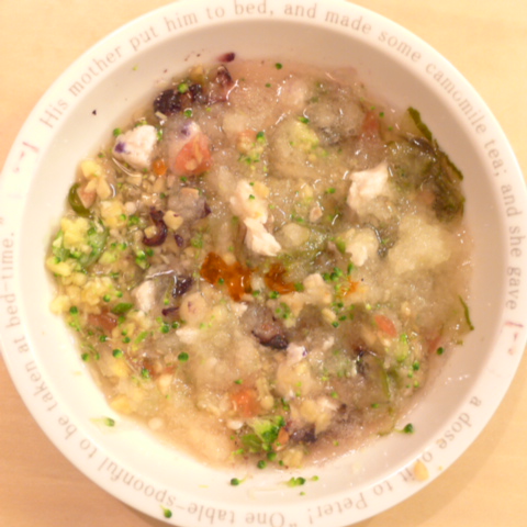 ぶり(熊本養殖)7.5g 南瓜15g ブルーベリー6g きゃべつ7g ブロッコリ芽7g 昆布0.2g 黒ごま2g 小岩井10g 湯60cc bio2/3g VC0.2g Ca0.2g