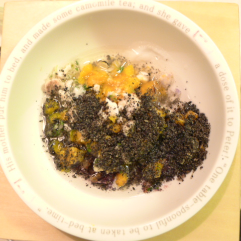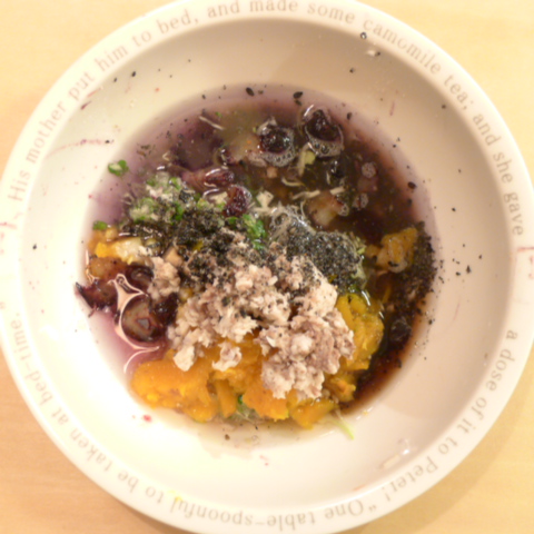 いわし7g 南瓜18g ブルーベリー6g きゃべつ5g ブロッコリ芽5g 舞茸出汁5g 黒ごま2g 小岩井10g 湯70cc ebi1T bio2/3g Ca0.2g Zn1/8T