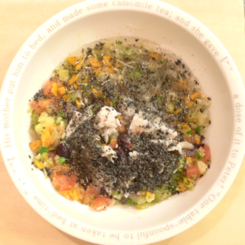 鯛7.5g 納豆2.1g さつま芋13g 南瓜10g ブルーベリー6g きゃべつ7g ブロッコリ6g もやし7g トマト12g 昆布0.3g 黒ごま3g 小岩井10g 湯100cc ebi1T bio2/3g VC0.2g Ca0.2g