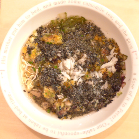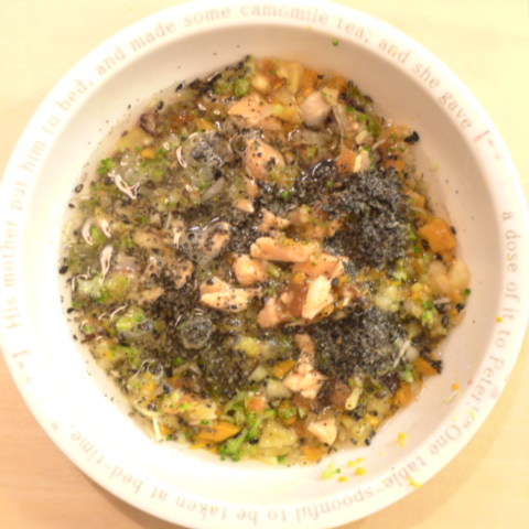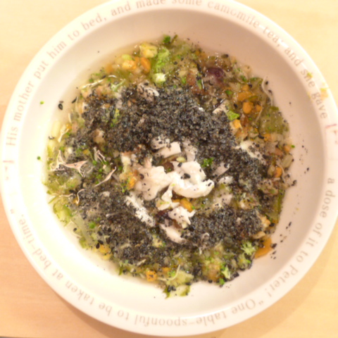 あじ7.5g 納豆2.1g さつま芋15g 南瓜5g ブルーベリー6g きゃべつ7g ブロッコリ6g もやし5g トマト12g 舞茸5g+舞茸出汁5g 昆布0.3g 黒ごま3g 小岩井10g 湯100cc ebi1T bio2/3g VC0.2g Ca0.2g Zn1/8T