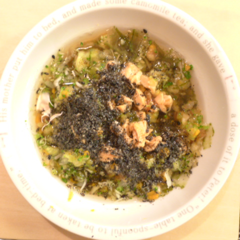 鮭7.5g さつま芋15g 南瓜8g ブルーベリー6g きゃべつ8g ブロッコリ芽3.5g ブロッコリ5g もやし5g トマト12g 昆布0.3g 黒ごま3g 小岩井10g 湯100cc ebi1T bio2/3g VC0.2g Ca0.2g